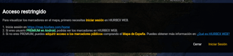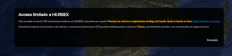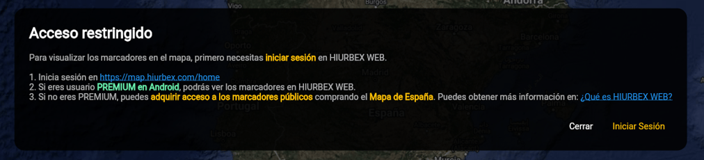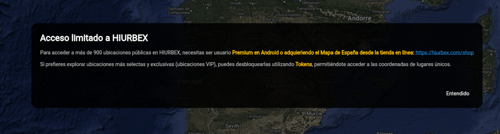Una vez que hayas accedido al mapa, si no has adquirido el Mapa de España para desbloquear todas las ubicaciones públicas de HIURBEX o no eres usuario Premium en Android, aparecerá el siguiente mensaje de advertencia.