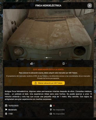 Como se muestra en la imagen anterior, el usuario ha desbloqueado con éxito la ubicación de "COLONIA CEMENTERA 1903" sin necesidad de adquirir el Mapa de España. Esto ha sido posible comprando directamente las coordenadas del marcador VIP utilizando Tokens.