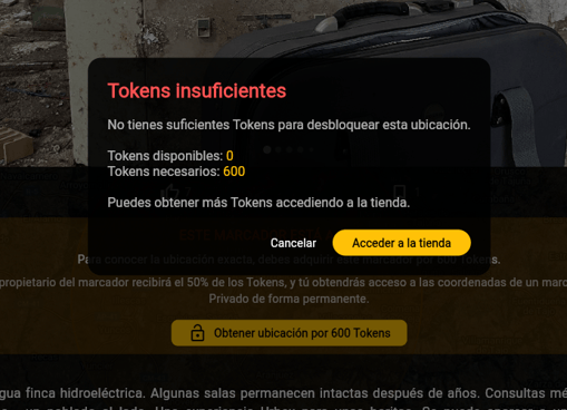 Si la cantidad de Tokens es mayor o igual al precio, la compra se procesa exitosamente y obtendrás acceso inmediato a las coordenadas exactas del marcador.