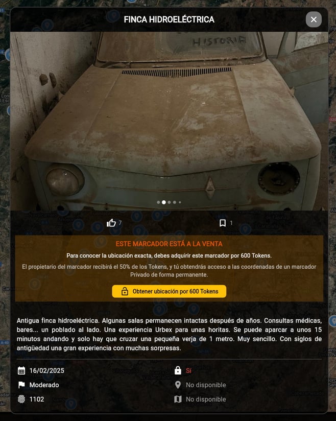 HIURBEX ofrece marcadores exclusivos (ubicaciones VIP) que requieren Tokens para desbloquear sus coordenadas exactas. Además, puedes acceder al Mapa completo de ubicaciones públicas, que te permitirá explorar más de 900 localizaciones verificadas en España.